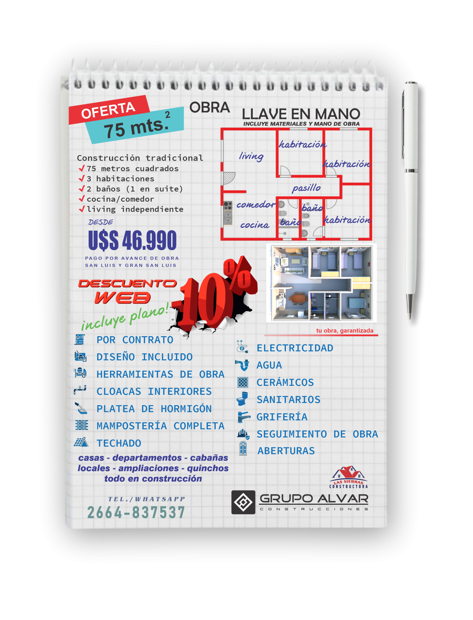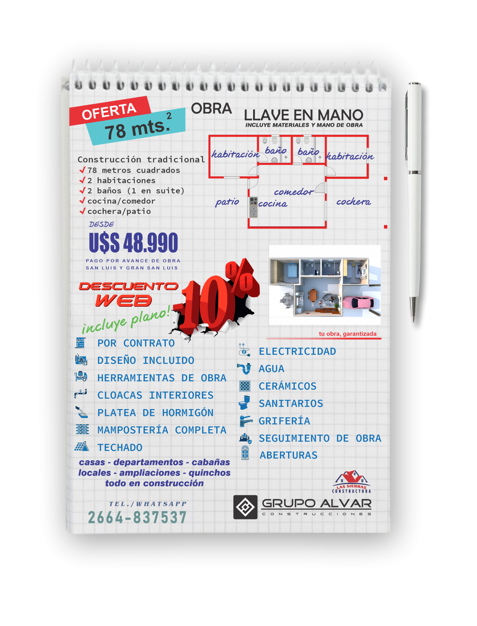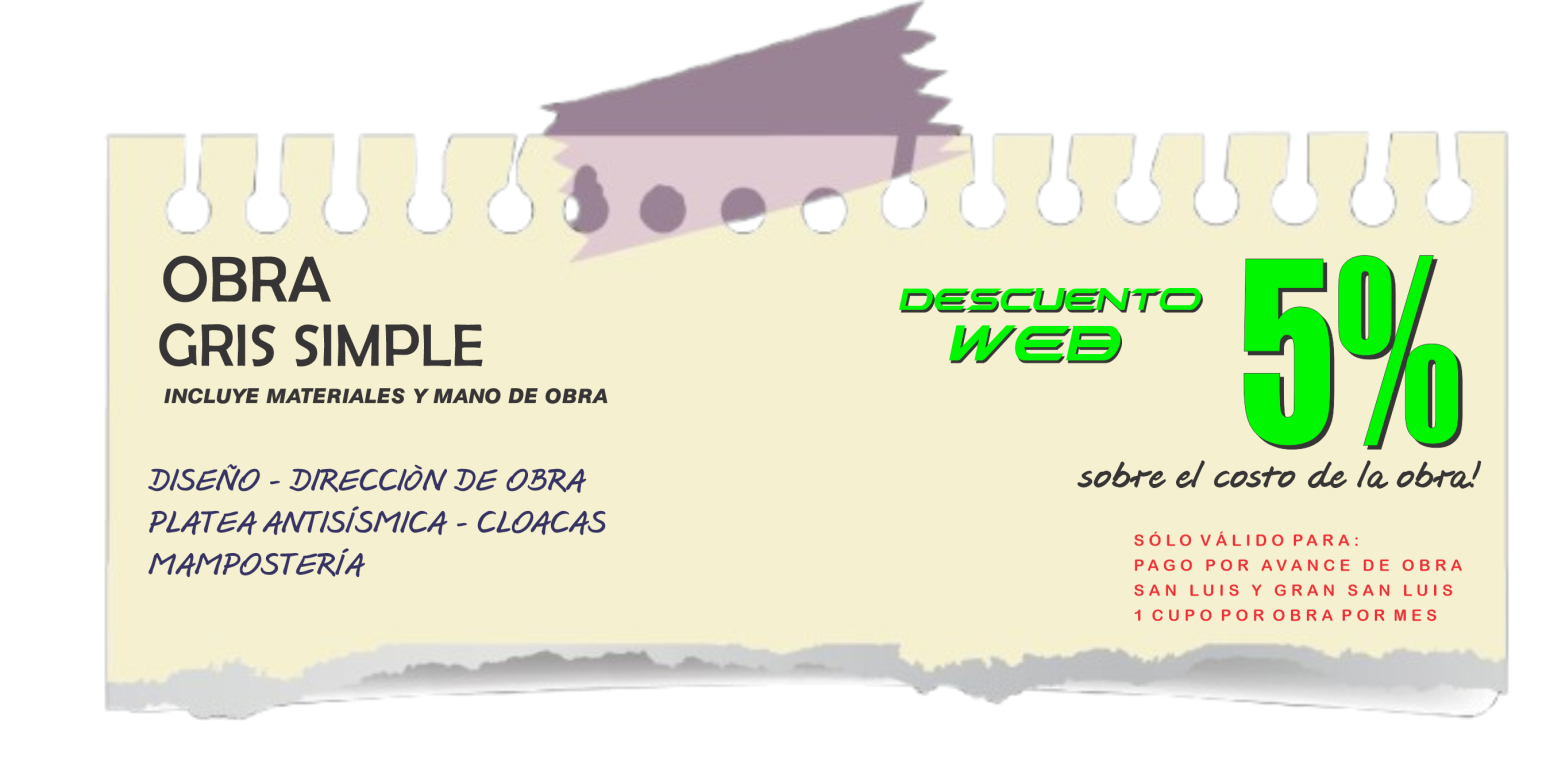 Consulte disponibilidad, las ofertas publicadas no son combinables, descripción de lo incluido en cada oferta publicada. Consulte sobre preferencias específicas que desee modificar en cada promoción publicada. Ofertas publicadas válidas para ciudad de San Luis y Gran San Luis (radio de 10 kilómetros desde San Luis Capital). Todas las ofertas publicadas en servicio llave en mano incluyen instalaciones completas de cloacas, agua caliente y fría en termofusión, instalación eléctrica completa con puntos, tomas y cableado, aberturas, cerámicos en todos los pisos cubiertos de la casa, revestimiento en paredes de baños y sector cocina, sanitarios, grifería de baño completa, terminación en fino o sistema ladrillo visto o rasado según proyecto, techado con tirantes, machimbre, aistante y chapas. Sistema llave en mano, materiales y mano de obra. Sólo 1 cupo por promoción. Las ofertas pueden quedar sin efecto o validez sin previo aviso.