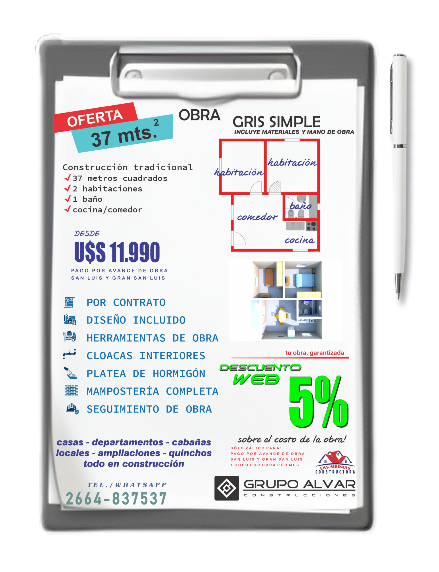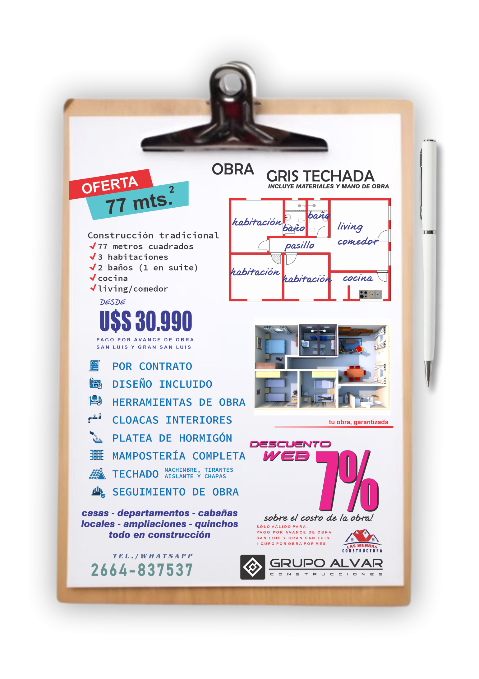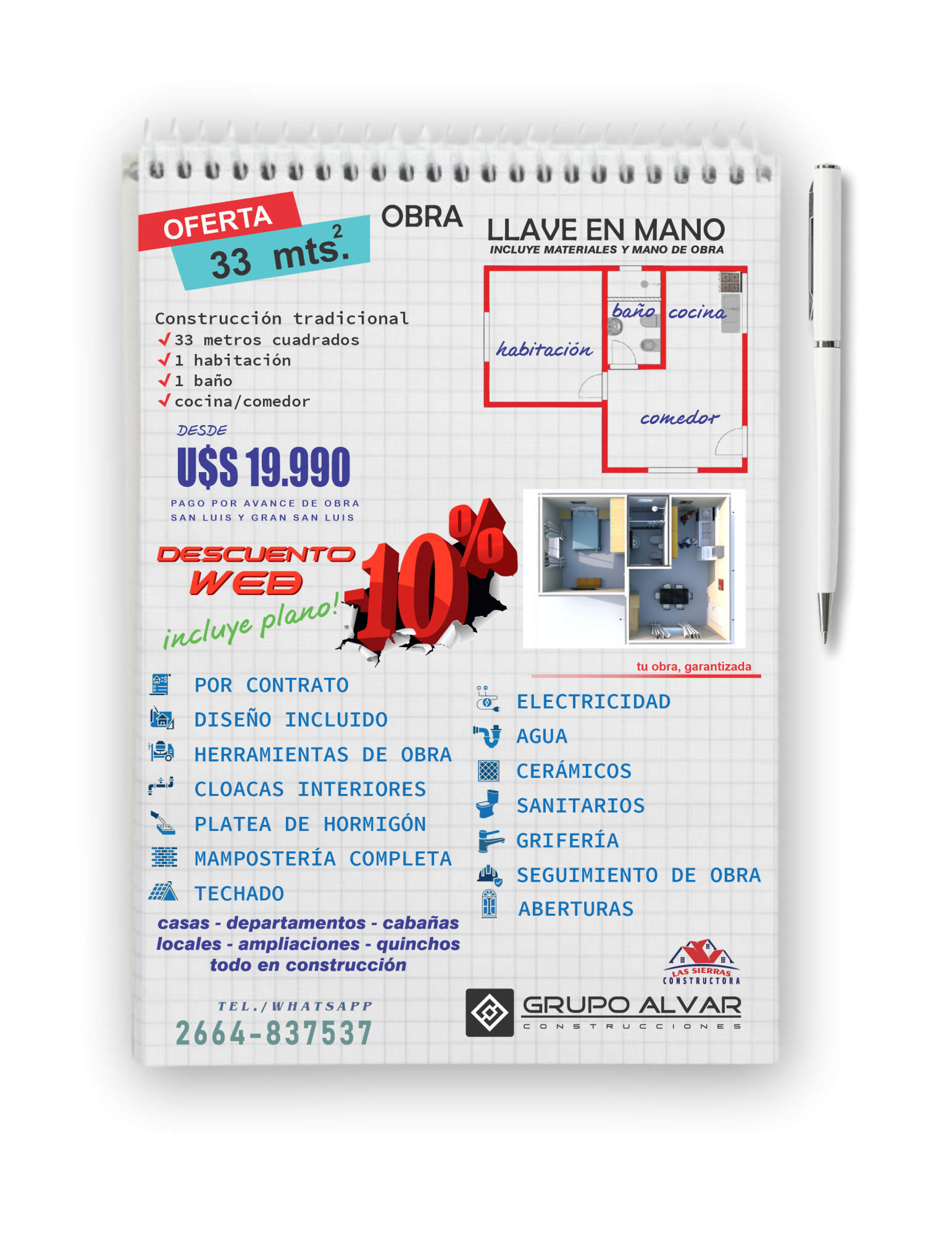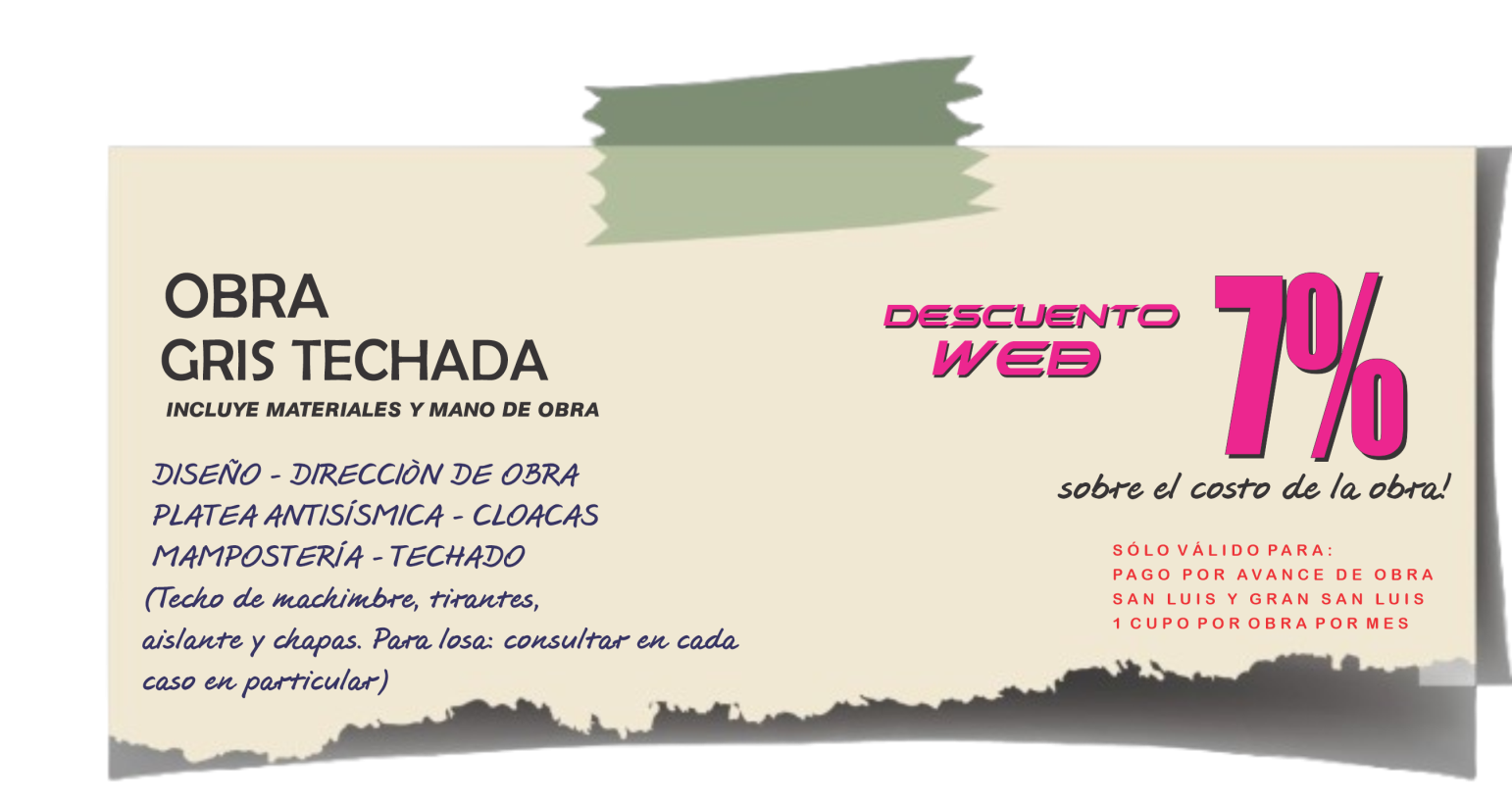 Consulte disponibilidad, las ofertas publicadas no son combinables, descripción de lo incluido en cada oferta publicada. Consulte sobre preferencias específicas que desee modificar en cada promoción publicada. Ofertas publicadas válidas para ciudad de San Luis y Gran San Luis (radio de 10 kilómetros desde San Luis Capital). Todas las ofertas publicadas en servicio llave en mano incluyen instalaciones completas de cloacas, agua caliente y fría en termofusión, instalación eléctrica completa con puntos, tomas y cableado, aberturas, cerámicos en todos los pisos cubiertos de la casa, revestimiento en paredes de baños y sector cocina, sanitarios, grifería de baño completa, terminación en fino o sistema ladrillo visto o rasado según proyecto, techado con tirantes, machimbre, aistante y chapas. Sistema llave en mano, materiales y mano de obra. Sólo 1 cupo por promoción. Las ofertas pueden quedar sin efecto o validez sin previo aviso.